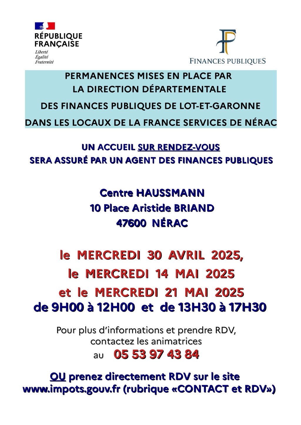 Dans le cadre de la campagne déclarative 2025 des revenus, un agent des Finances Publiques assurera des permanences dans nos locaux à Nérac, ainsi que sur Mézin.