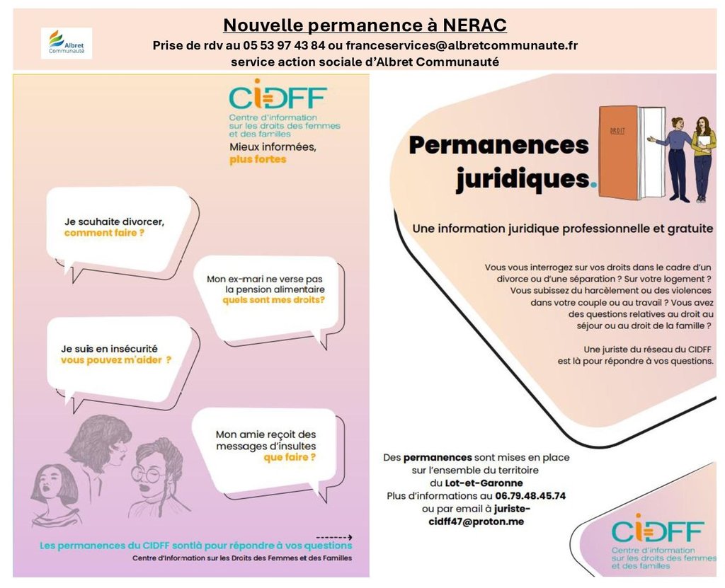 À partir du mois d’août 2025, une nouvelle permanence se tiendra à Nérac. Il s’agit du CIDFF, Centre d’information sur les droits des femmes et des familles.