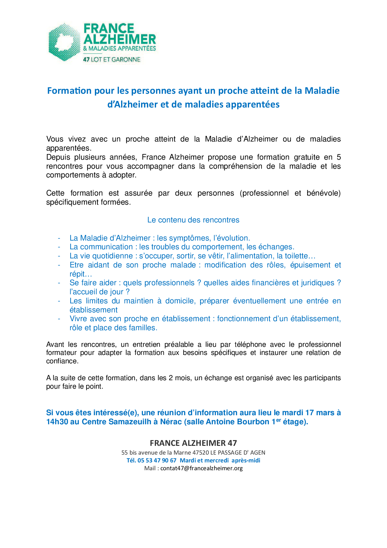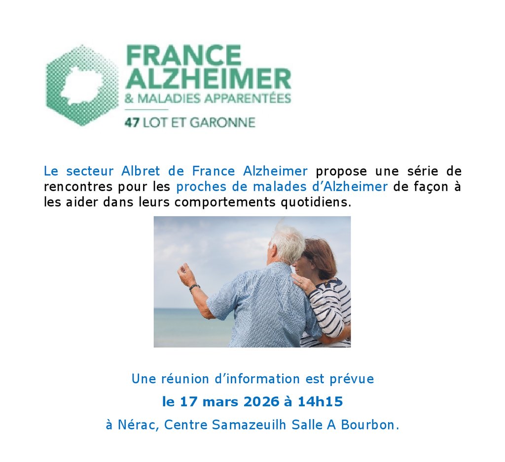 Le secteur Albret de France Alzheimer Lot et Garonne relance des activités et notamment une série de rencontres pour les proche des malades, de façon à les aider dans leurs comportements quotidiens