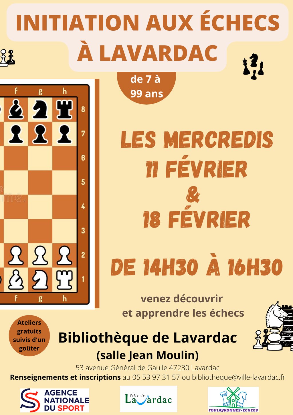 Les passionnés d'échecs, débutants ou confirmés, sont invités à participer aux ateliers d'échecs gratuits organisés par la Bibliothèque de Lavardac ! Deux sessions auront lieu les 11 et 18 février, salle Jean Moulin (à droite de la mairie).