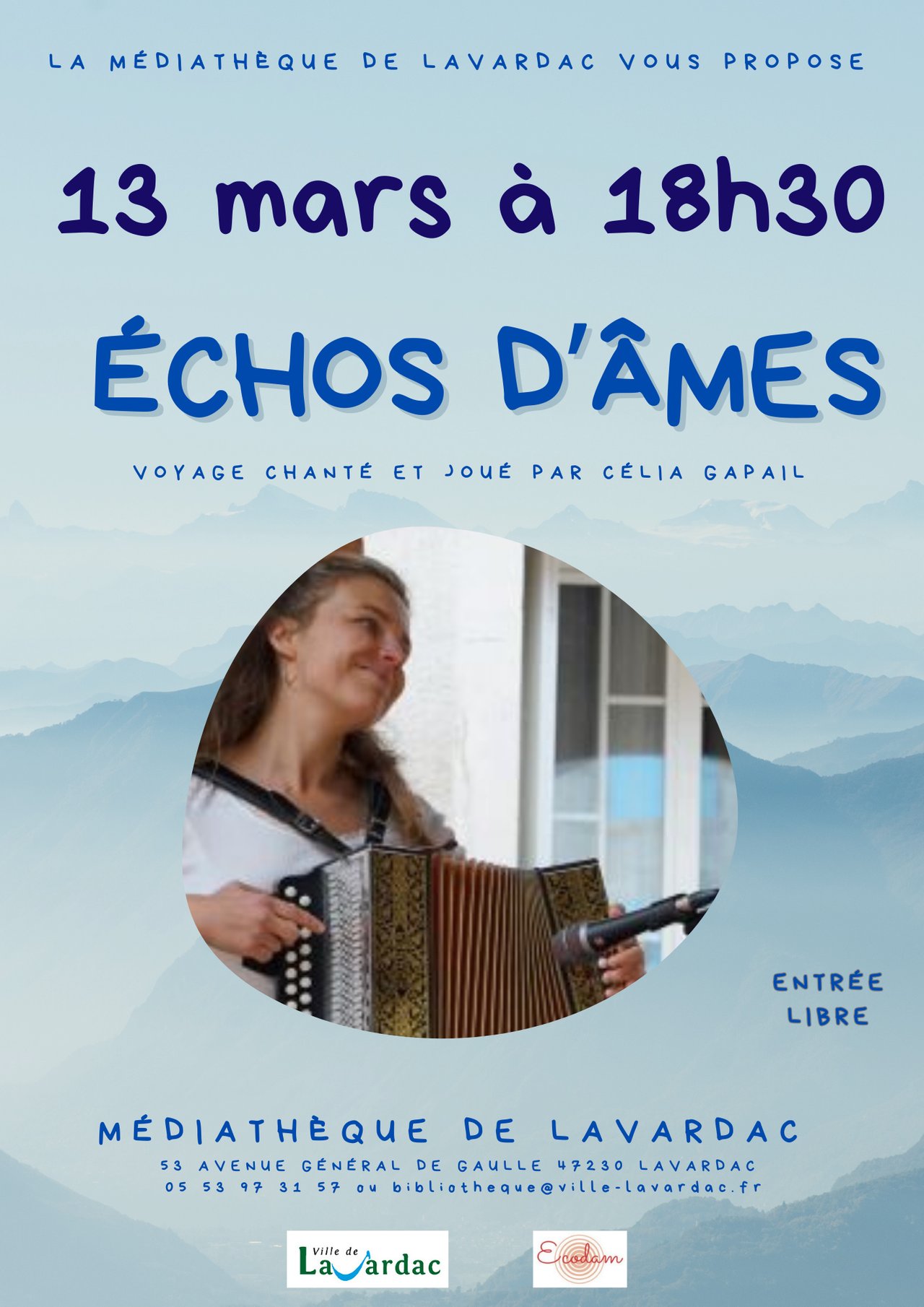 Laissez-vous transporter par une soirée placée sous le signe de l'émotion et de la poésie. La Médiathèque de Lavardac a le plaisir de vous inviter à découvrir "Échos d’Âmes", un spectacle unique porté par le talent de Célia Gapail.